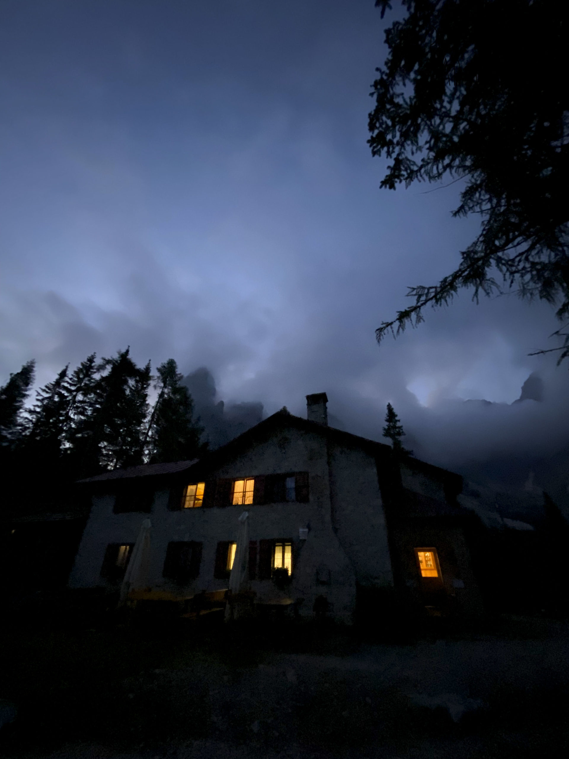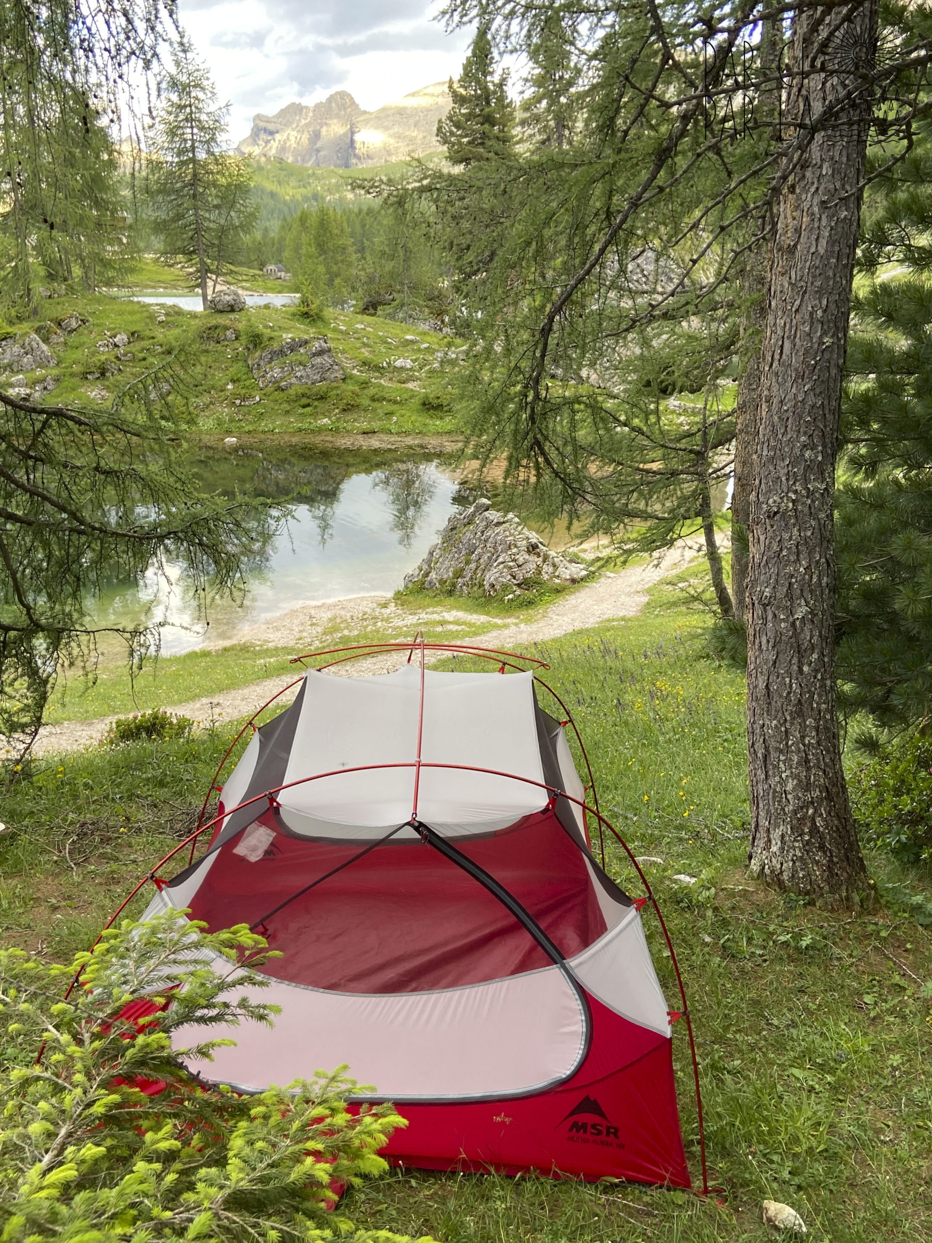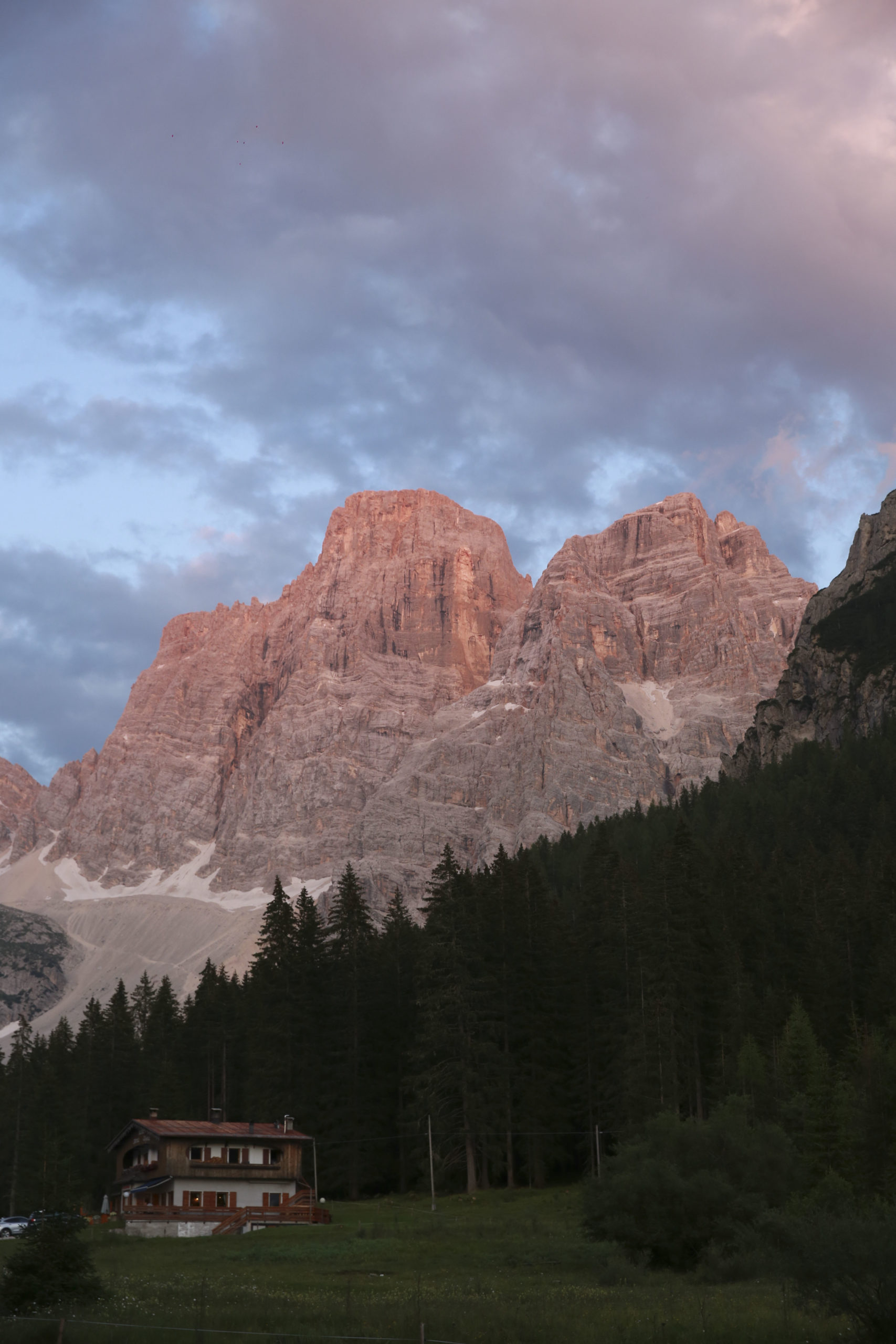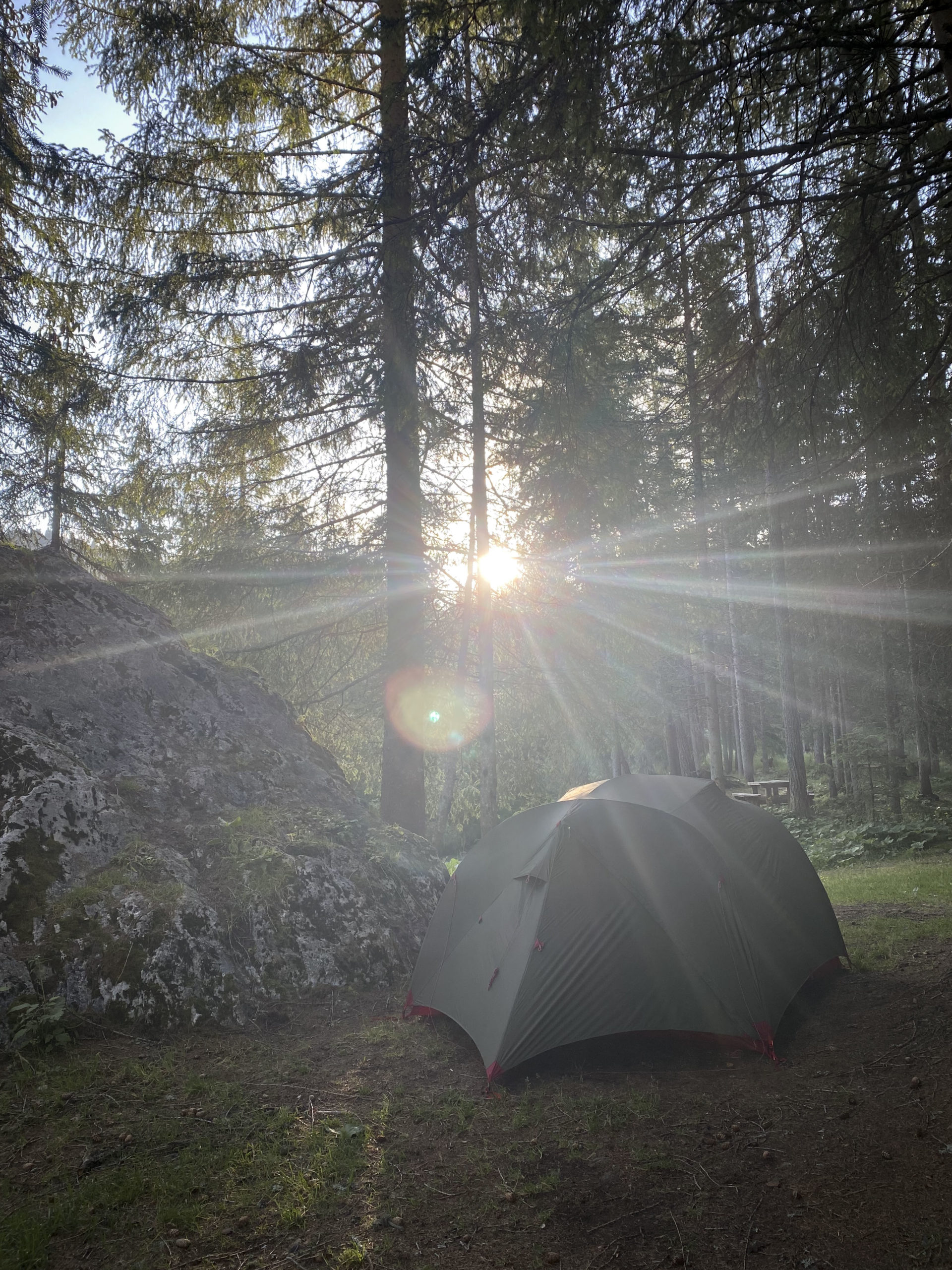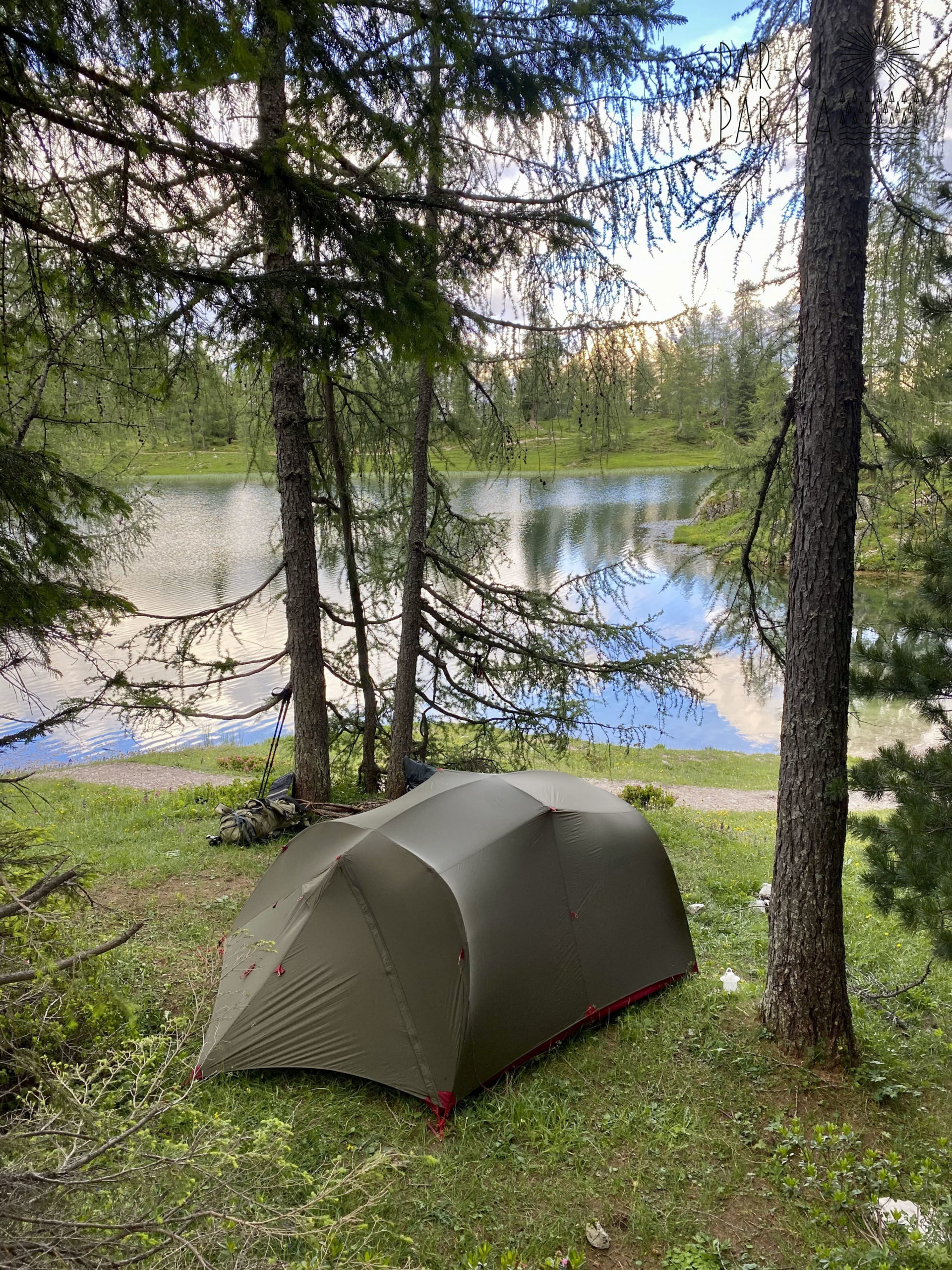 Le lac est superbe, entouré de sapins et encerclé d’un coté par l’impressionnante Cima Ambrizzola (2715m), et de l’autre sur Cortina d’Ampezzo. Après avoir fait le tour du lac pour trouver le bon spot de bivouac et attendre le crépuscule, on s’établit discrètement au bord du lac, caché du refuge. Diner lyophilisé avec le jetboil, petit thé et dodo.