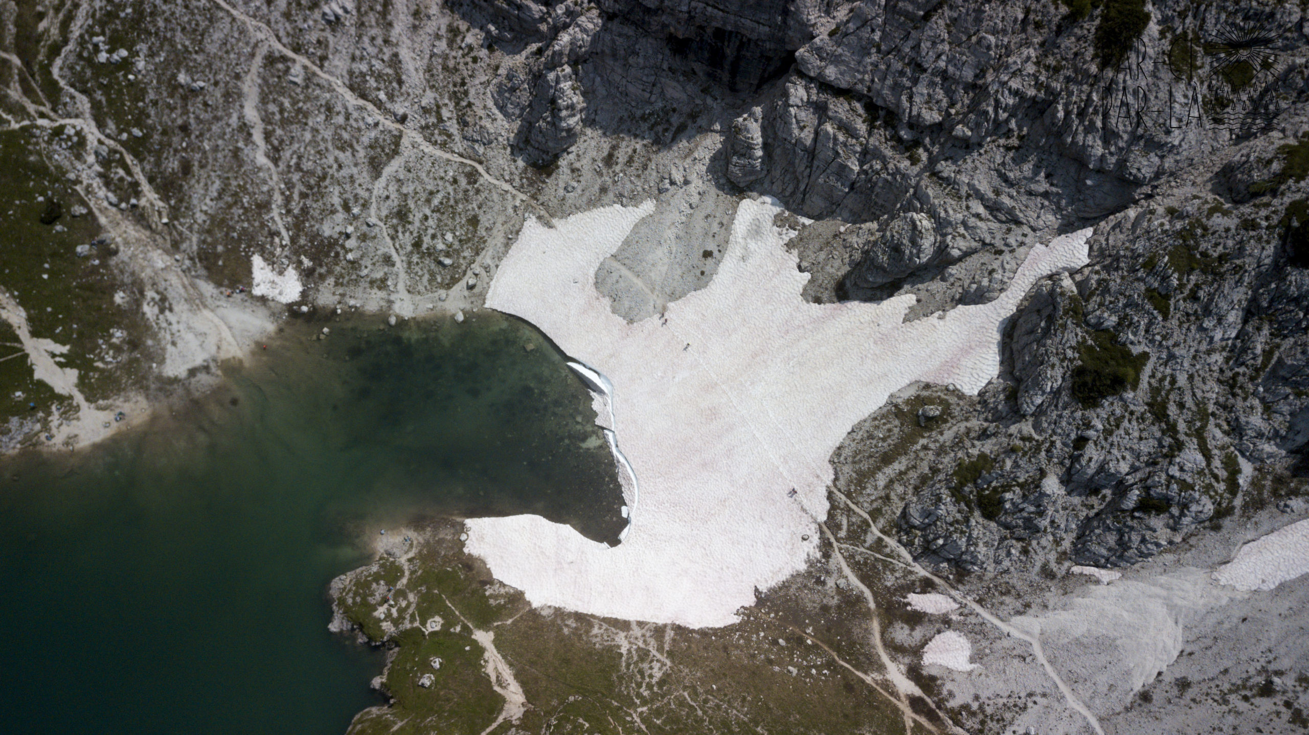 Le lac Coldai est encore partiellement enneigé, le paysage est superbe et on peut même apercevoir le lac d’Alleghe en contrebas. Ca y nous sommes au pied de la Civetta ! Montagne impressionnante et aux dents acérées. Nous faisons une petite pause pour profiter du moment.