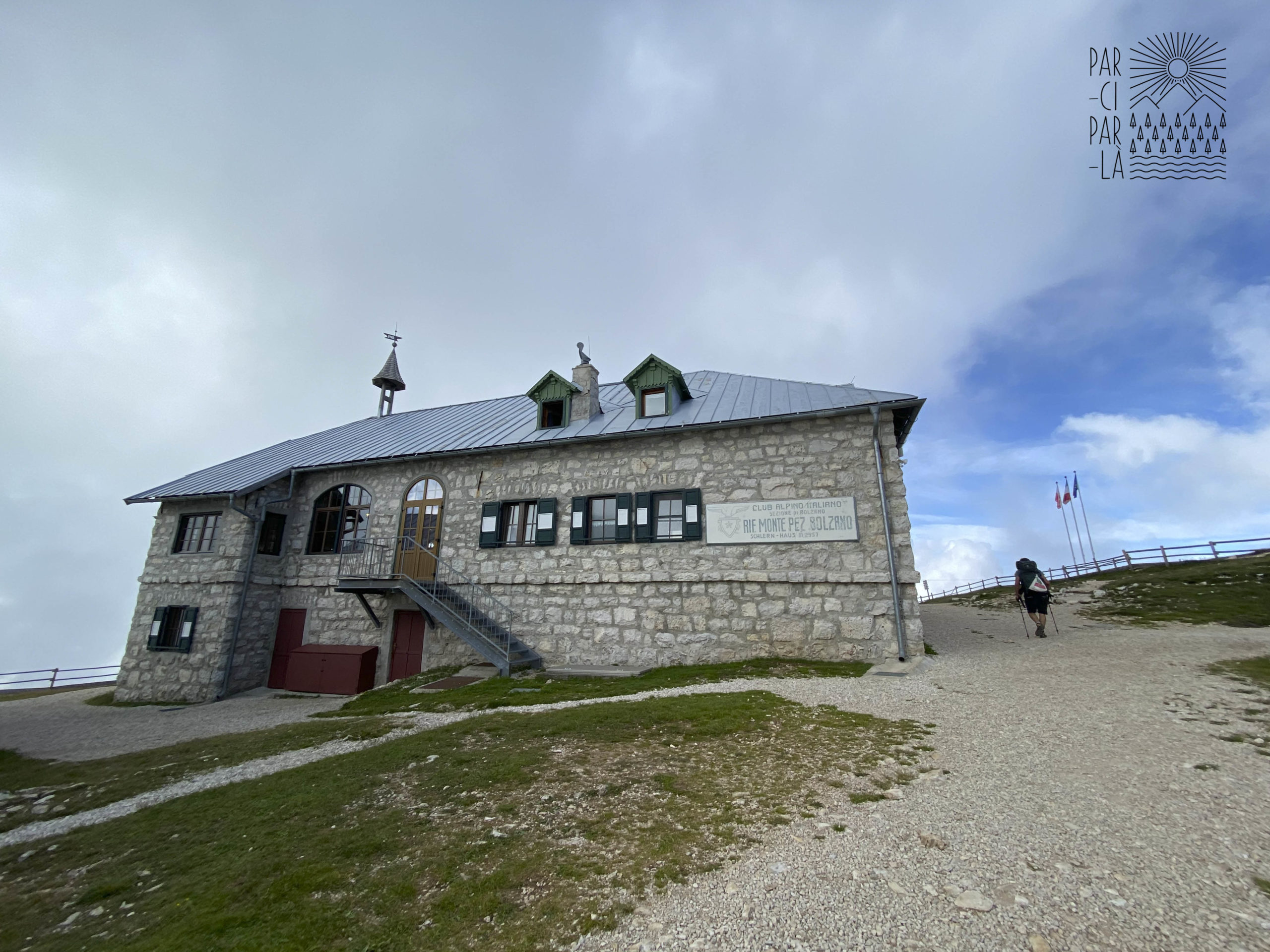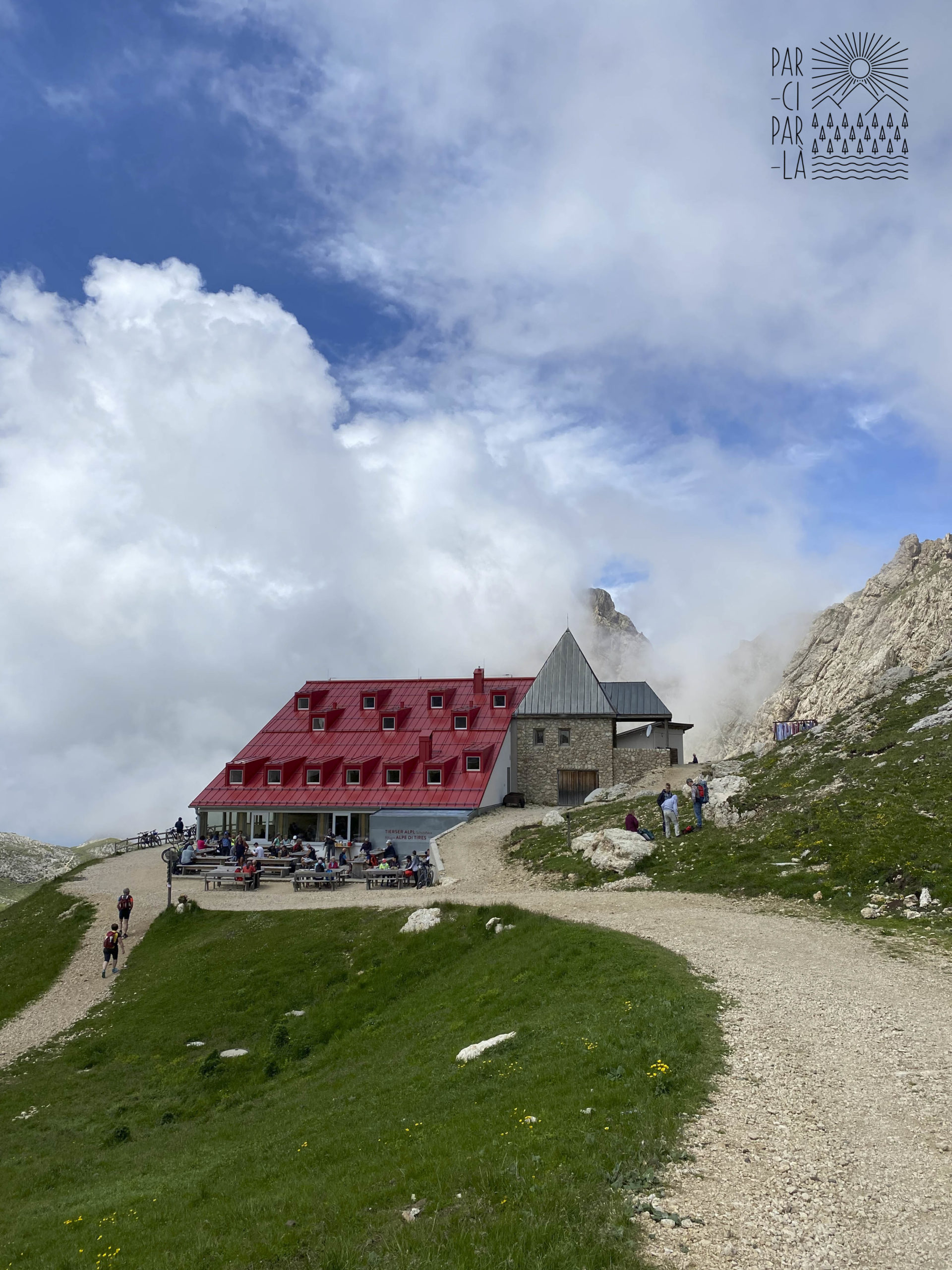 On se lève vers 5H30, nous sommes totalement dans la brume. Nous prenons le temps avant d’entamer la marche avec un petit 520 mètres de D+, histoire de bien se réveiller. Après une grosse heure de montée, on arrive enfin à l’altipiano du Sciliar où nous croisons quelques vaches, marmottes et chevaux. Nous continuons pendant 20 minutes avant d’arriver au rifugio Bolzano (ci-dessous) où nous prenons un petit déjeuner local.