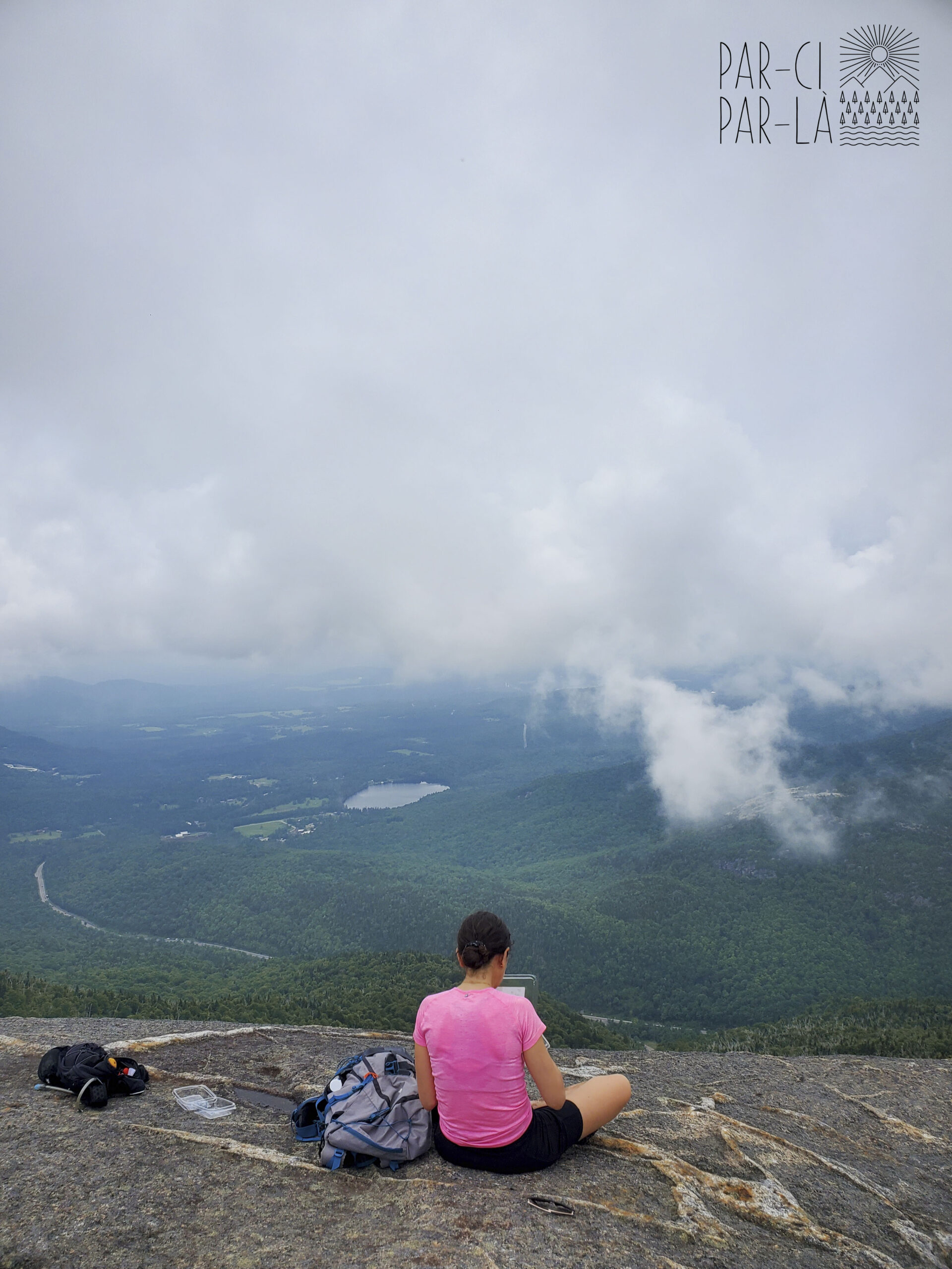 Peu de temps avant l’arrivée du sommet, un premier point de vue permet un petit arrêt ravitaillement bien mérité, mais il faut vraiment continuer pour arriver au sommet. Une nouvelle vue sur Lake Placid et la vallée s’offre à nous mais le ciel est menaçant et l’orage n’est pas loin.