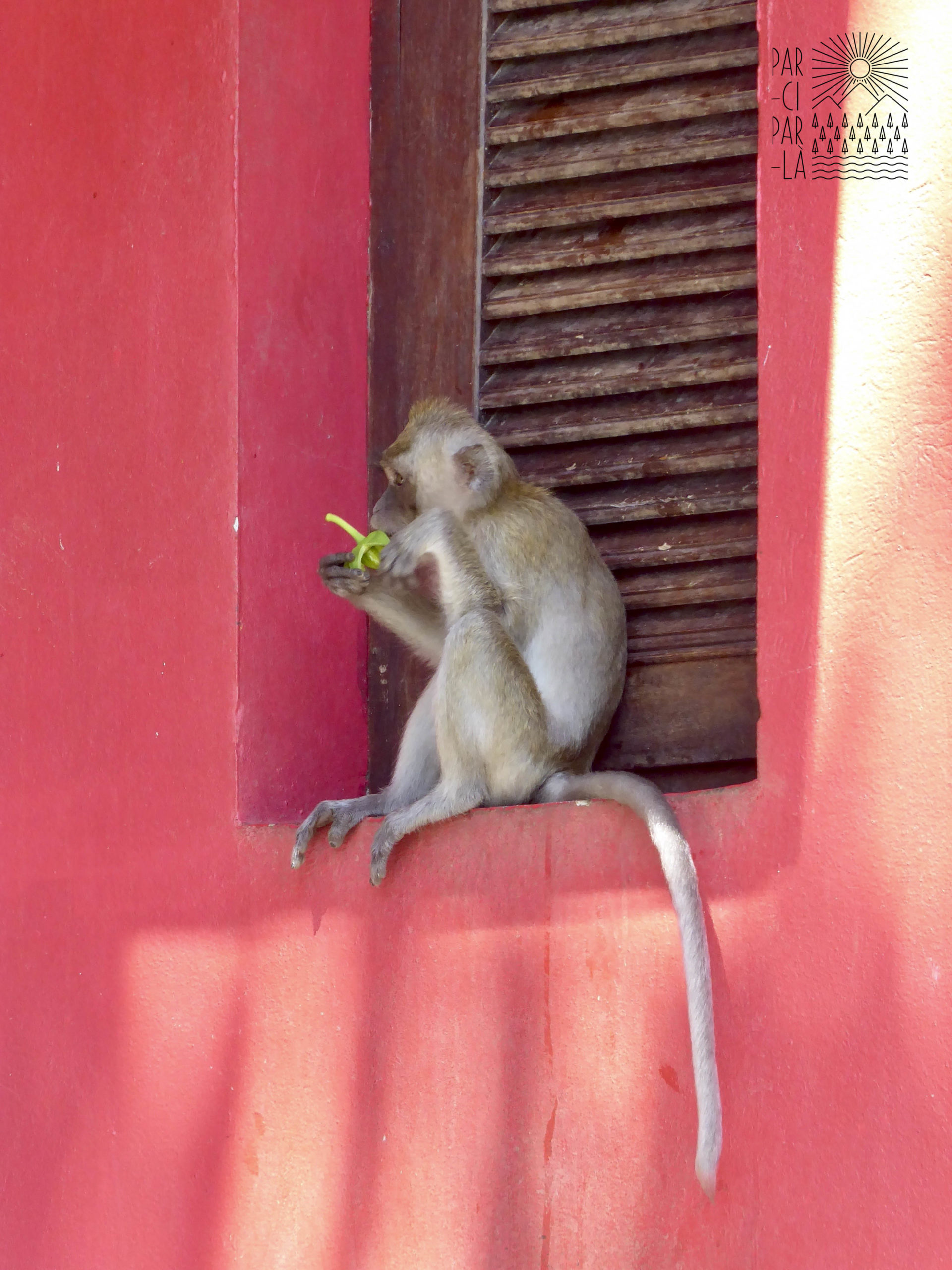Nous commençons par l’ascension du temple situé à plus de 300 mètres d’altitude, au sommet d’une colline karstique. Pour mériter la vue, il faut gravir 1260 marches ! Nous avons mis un peu plus d’une demi heure pour monter, accompagnés par les singes.