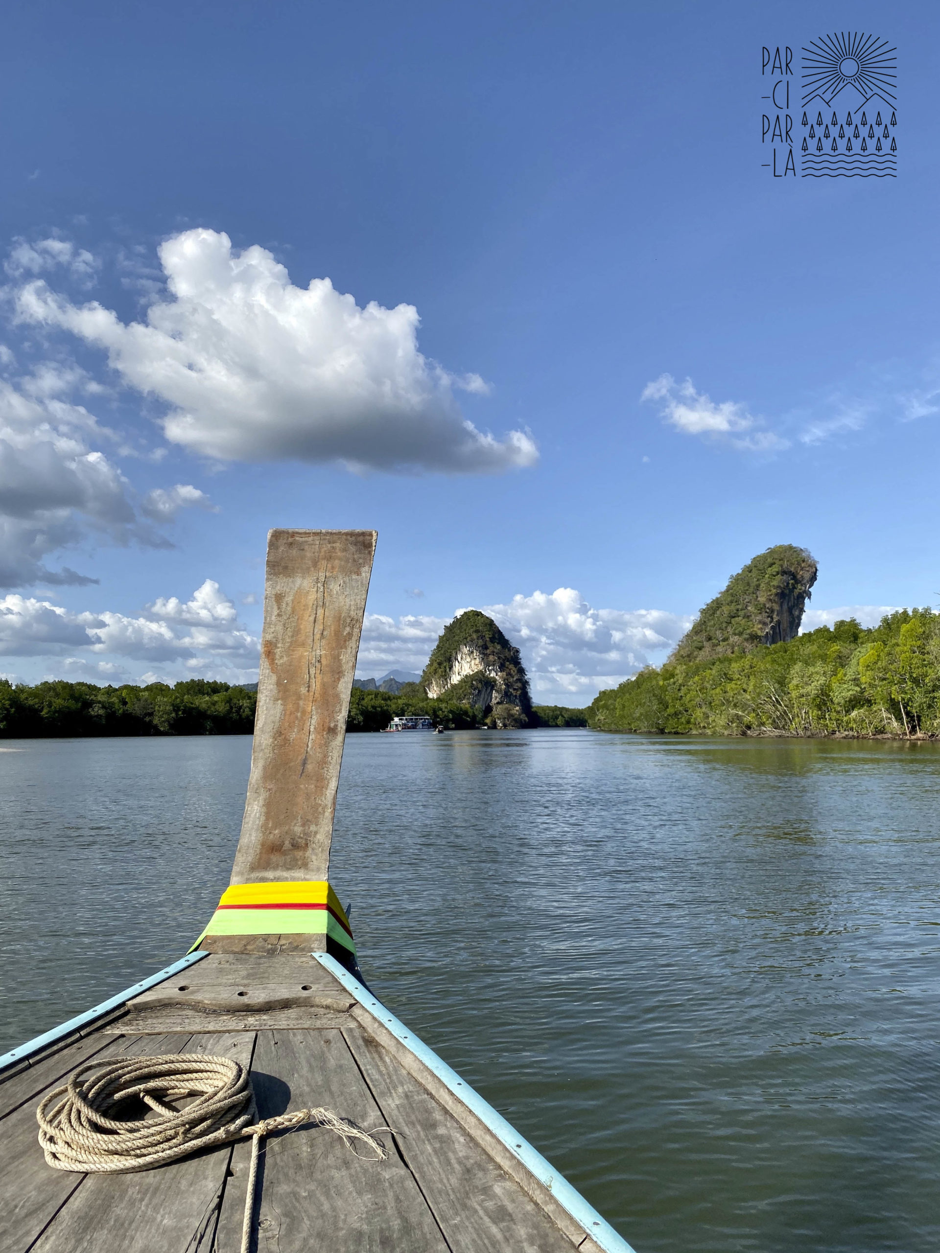 Depuis le quai Chao Fa à Krabi, nous montons dans un long tail boat et parcourons les mangroves du fleuve de Krabi. Direction Khao Khanap Nam Cave, une grotte située dans une des 2 montagnes de Krabi, symboles de la ville. Après 15 minutes de trajet, nous arrivons à Khao Khanap Nam Cave. A l’intérieur, des stalactites et stalagmites surplombent la grotte. L’histoire raconte que durant la Seconde Guerre Mondiale, les soldats japonais y auraient caché toutes leurs armes.