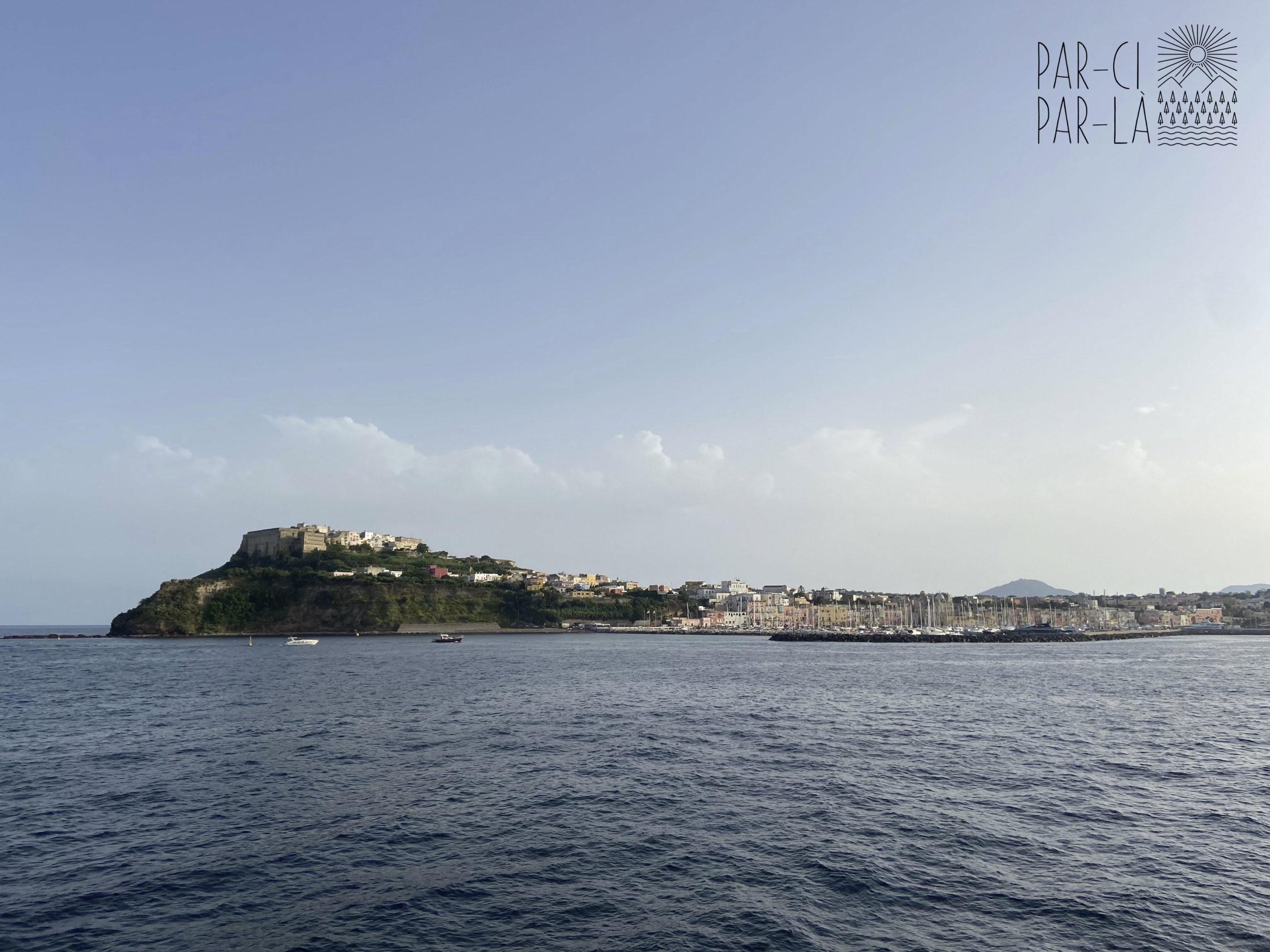 Nous prenons le bateau à Naples avec la voiture vers 17h30 (attention l’organisation du chargement des voitures sur le bateau est chaotique), la vue sur la ville de Naples est magnifique avec la lumière du soir. Le bateau fait une courte escale sur la petite île de Procida, qui sera capitale italienne de la culture en 2022 puis il poursuit son chemin jusqu’à Ischia Porto où nous débarquons vers 19h.